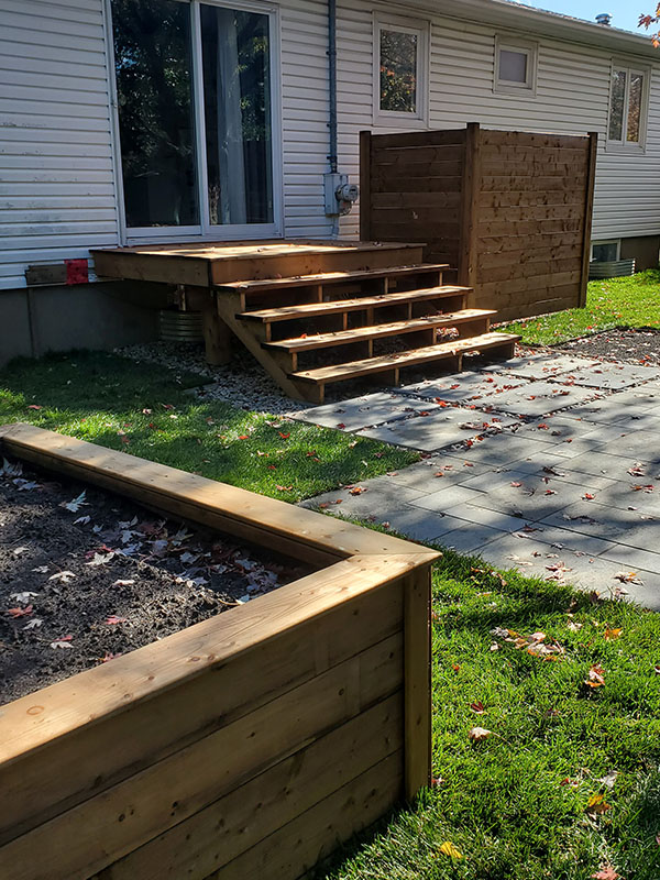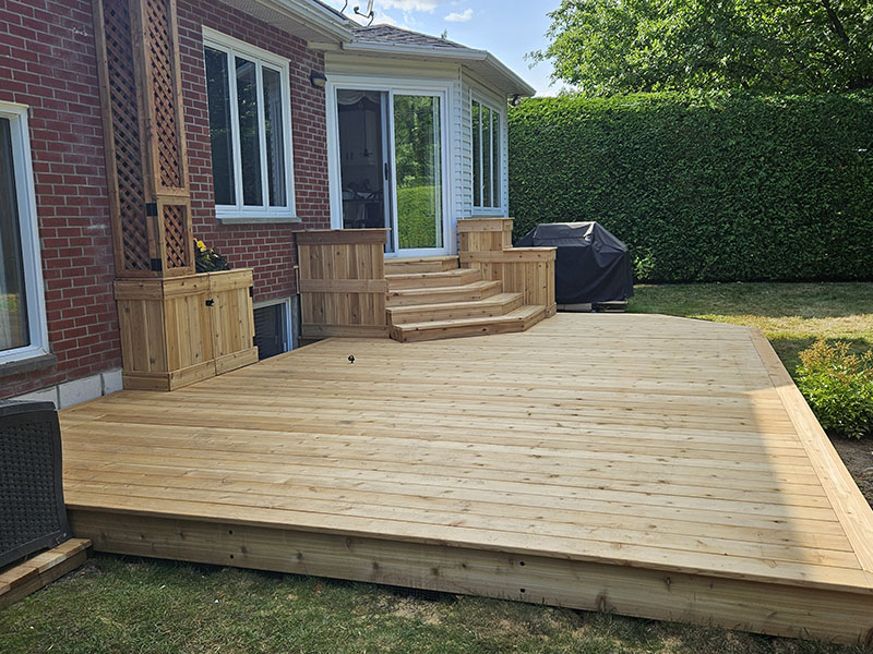 Suite à la récolte de vos réponses, nous vous proposerons le plan de votre future terrasse. Concernant les matériaux utilisés, nous travaillons avec du bois traité, du cèdre et du bois de composite. Nous effectuons tous les travaux de menuiserie nécessaires à sa fabrication. Nous pouvons aussi concevoir des terrasses en pierres naturelles ainsi que l'aménagement paysager de votre espace (fleurs et arbustes). Tous les projets que nous proposons sont clés en main. Avec notre équipe d'experts, vous n'aurez aucun souci à avoir.
